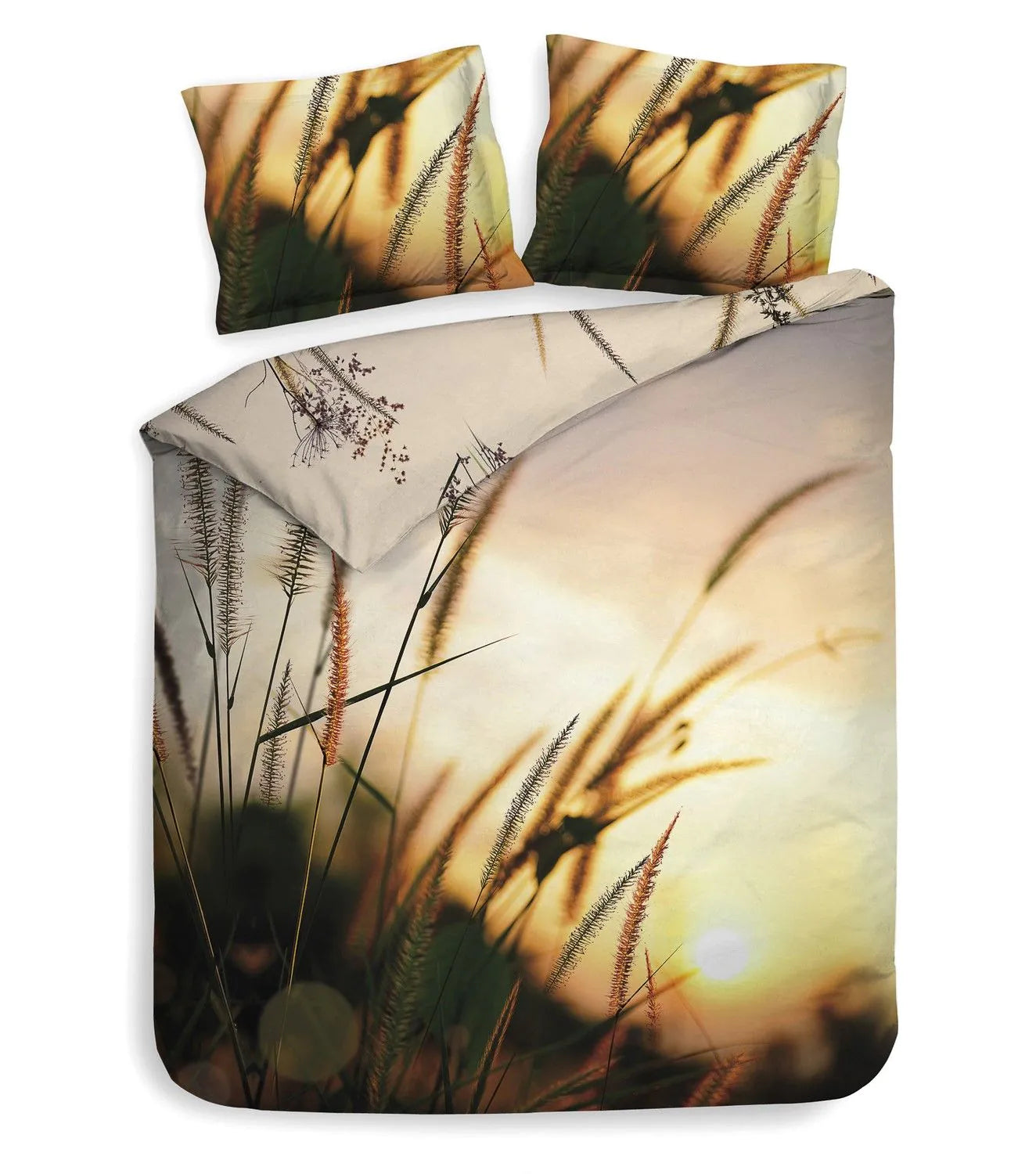 On the Hamilton duvet cover you can see the sun setting from the grass. Various reed stems are in the foreground of this beautiful design. The orange glow of the sunset and the color gradient in the sky make you dream of a sultry summer evening. The double-sided printed duvet cover has a completely different design on the back. Tufts of different grass stems are spread over the beige background and create a calm appearance. The pillowcases also both have prints and are finished with an Oxford edge.