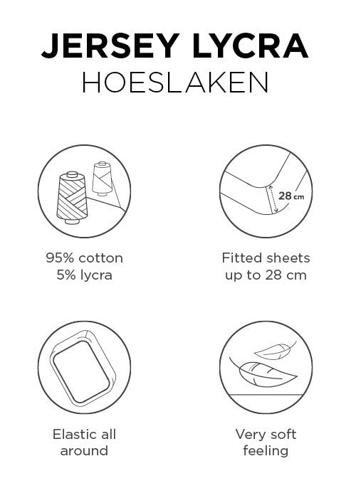 Ce drap housse est composé à 95% de Jersey et à 5% de Lycra. Vous vous demandez peut-être quelle différence fait ce petit pourcentage de Lycra. La réponse est simple : ajouter un peu de lycra donne à votre drap-housse un peu plus d'élasticité qu'un drap-housse en jersey ordinaire. Une fonctionnalité pratique ! Avec un drap-housse en jersey lycra, vous pouvez profiter d'un lit magnifiquement et soigneusement fait sans trop de tracas. Changer le linge de lit est-il une tâche longue et ennuyeuse ? Les draps-housses en Jersey Lycra de Beddinghouse ne sont pas si mal !