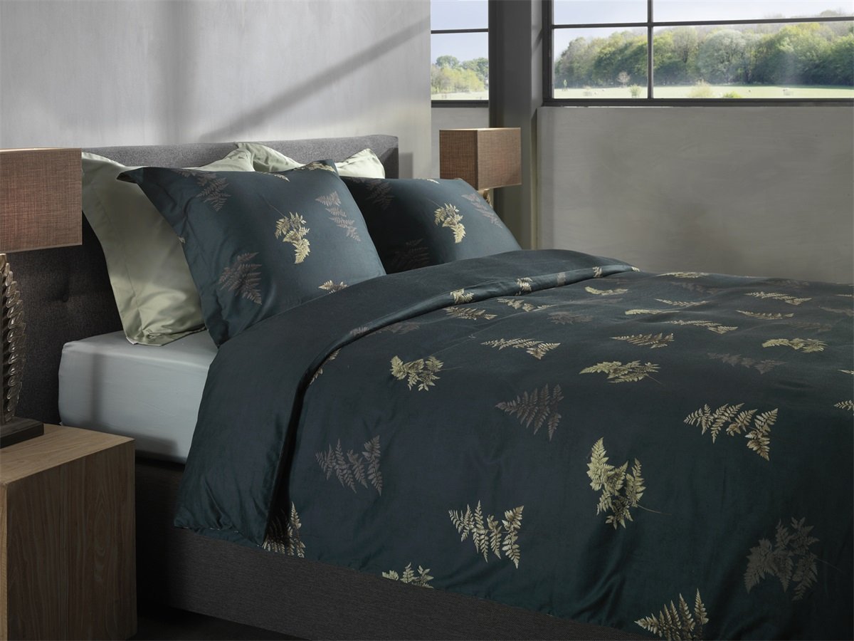 Heckett Lane Holly Navy Blue housse de couette en satin de coton fougères, feuilles, clochettes bleues
