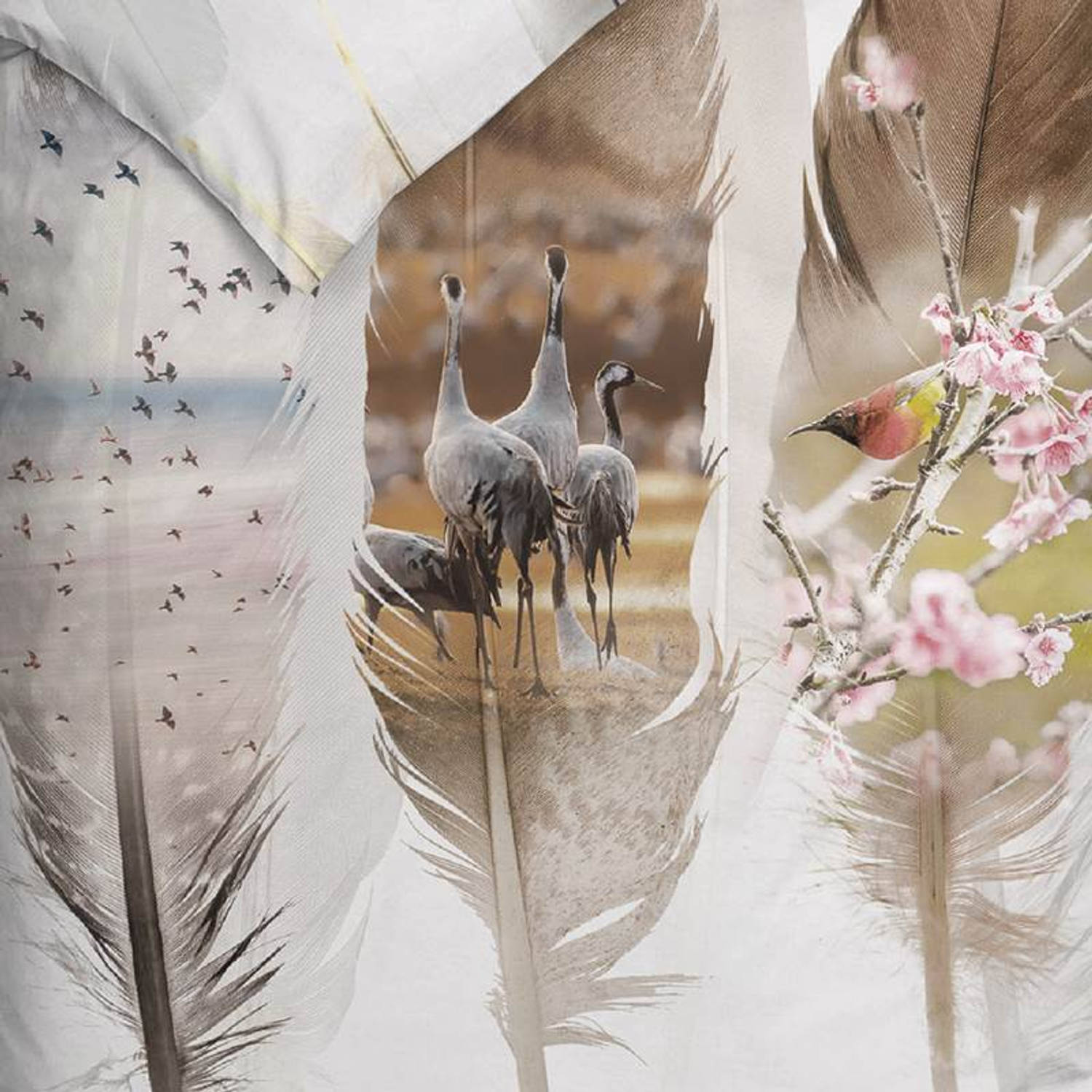 À l'arrière nous voyons différentes plumes dans de beaux tons terreux. Les taies d'oreiller assorties portent volontiers les deux motifs et peuvent donc être utilisées des deux côtés, tout comme la parure de lit. Cela vous permet de mélanger et assortir à votre guise.
