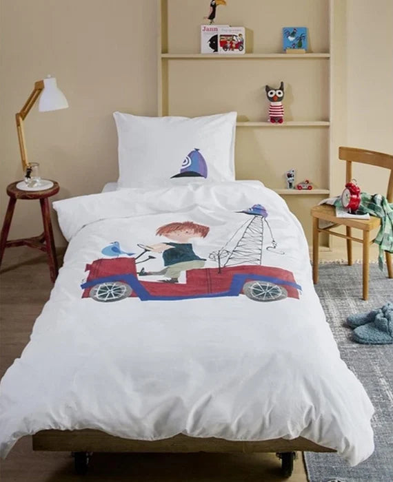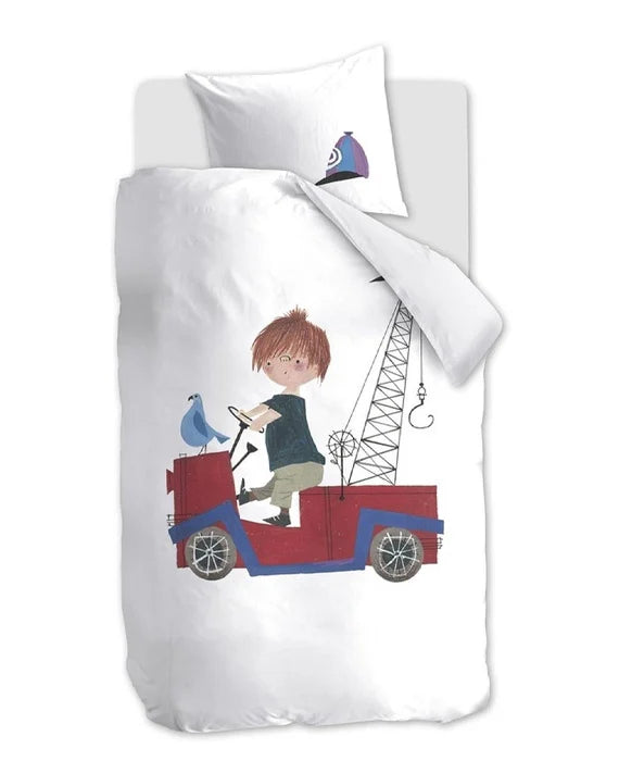 Dit rode wagentje sjeest vaak genoeg voorbij in veel kinderkamers. De voorkant van het populaire kinderboek Pluk van de Petteflet staat gigagroot afgebeeld op dekbedovertrek Rondjes Rijden van Beddinghouse x Fiep Amsterdam. Illustraties van Fiep Westendorp. De achterzijde van het overtrek heeft dezelfde print als de voorzijde. Het kinderdekbedovertrek is verpakt door middel van een FSC-banderol die direct om het setje heen zit. Vouw de banderol helemaal open en ontdek de kleurplaat die als verrassing aan de binnenkant van de verpakking zit. Ben je klaar met de verpakking? Gooi deze dan weg bij het oud papier voor recycling.Het dekbedovertrek is gemaakt van 100% katoen. 144 TC. Katoen is een natuurlijk product dat ademt en goed vocht opneemt. Het overtrek heeft een flap als instopstrook en een totale lengte van 200 cm.
