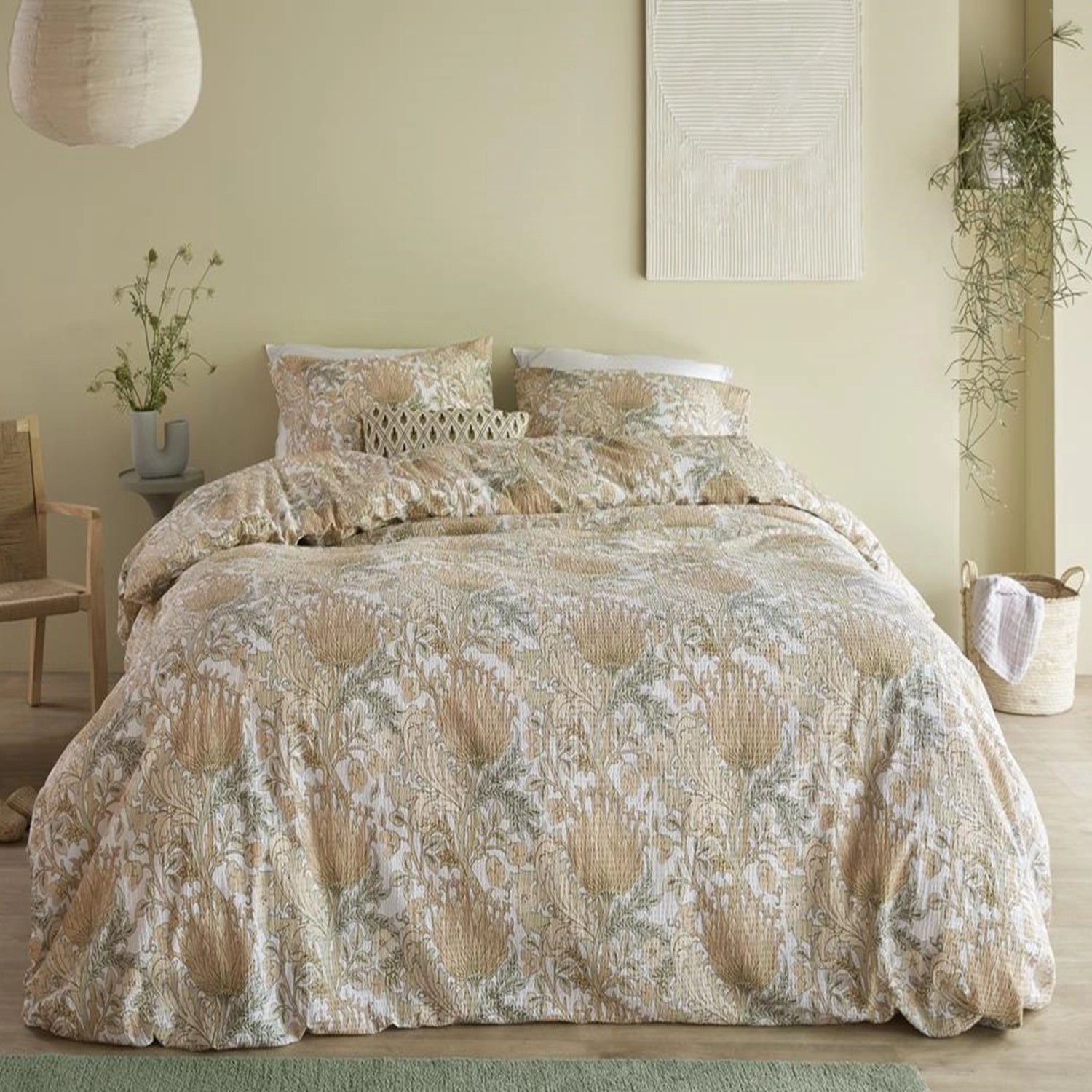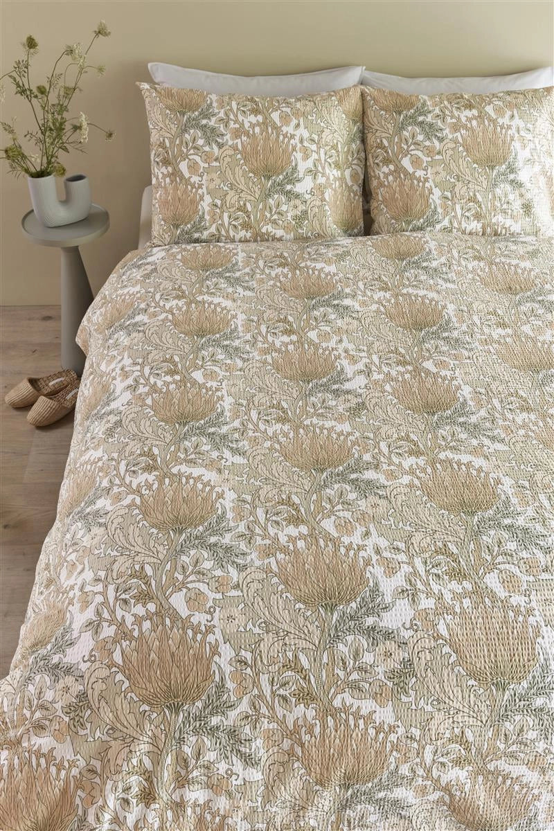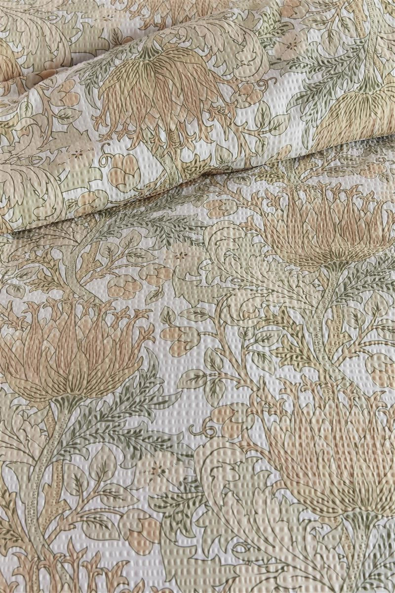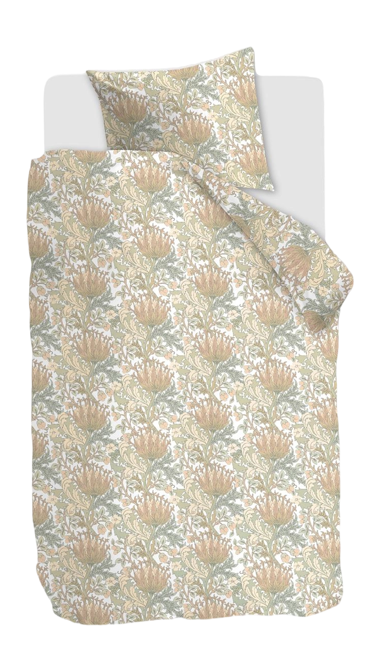 Een bladerenprint geïnspireerd op de stijl van William Morris is sierlijk afgebeeld op dekbedovertrek Gracia van Beddinghouse. De gestileerde artisjokbloemen, bladeren en klimmende takken hebben pasteltinten die prachtig contrasteren tegen een frisse witte achtergrond. De seersucker-stof, een lichtgewicht katoenen stof met een gerimpeld oppervlak, maakt dit dekbedovertrek perfect voor de zomer, omdat het ademend en koel aanvoelt op de huid. Het unieke gerimpelde uiterlijk geeft een mooi casual chique effect.