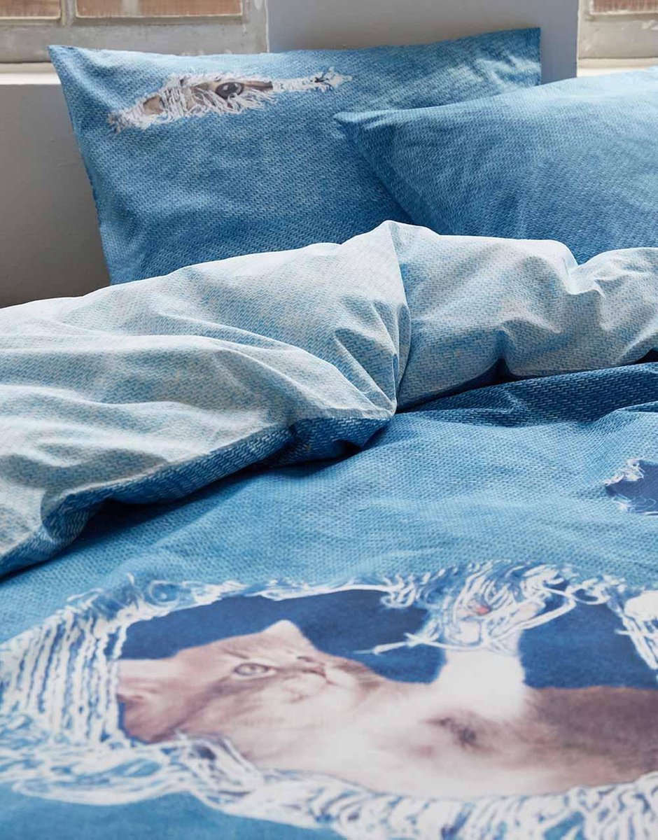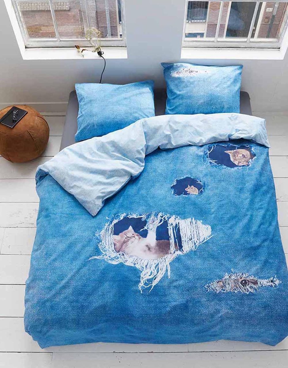 De voorkant van het dekbedovertrek heeft een blauwe jeans look met gaten er in waar katten en muizen uit komen. De achterkant van het dekbedovertrek heeft ook een blauwe jeans look maar dan in een tint lichter dan de voorkant. . Doordat de voorkant en achterkant verschillend van elkaar zijn kun je het dekbedovertrek aan 2 kanten gebruiken. Ben je de katten een keertje zat, dan draai je het dekbedovertrek gewoon om. Het dekbedovertrek is gemaakt van katoen en voelt zacht aan. Katoen neemt goed vocht op en ademt waardoor je fijn en fris kunt slapen. Met extra lange instopstrook over de gehele breedte.