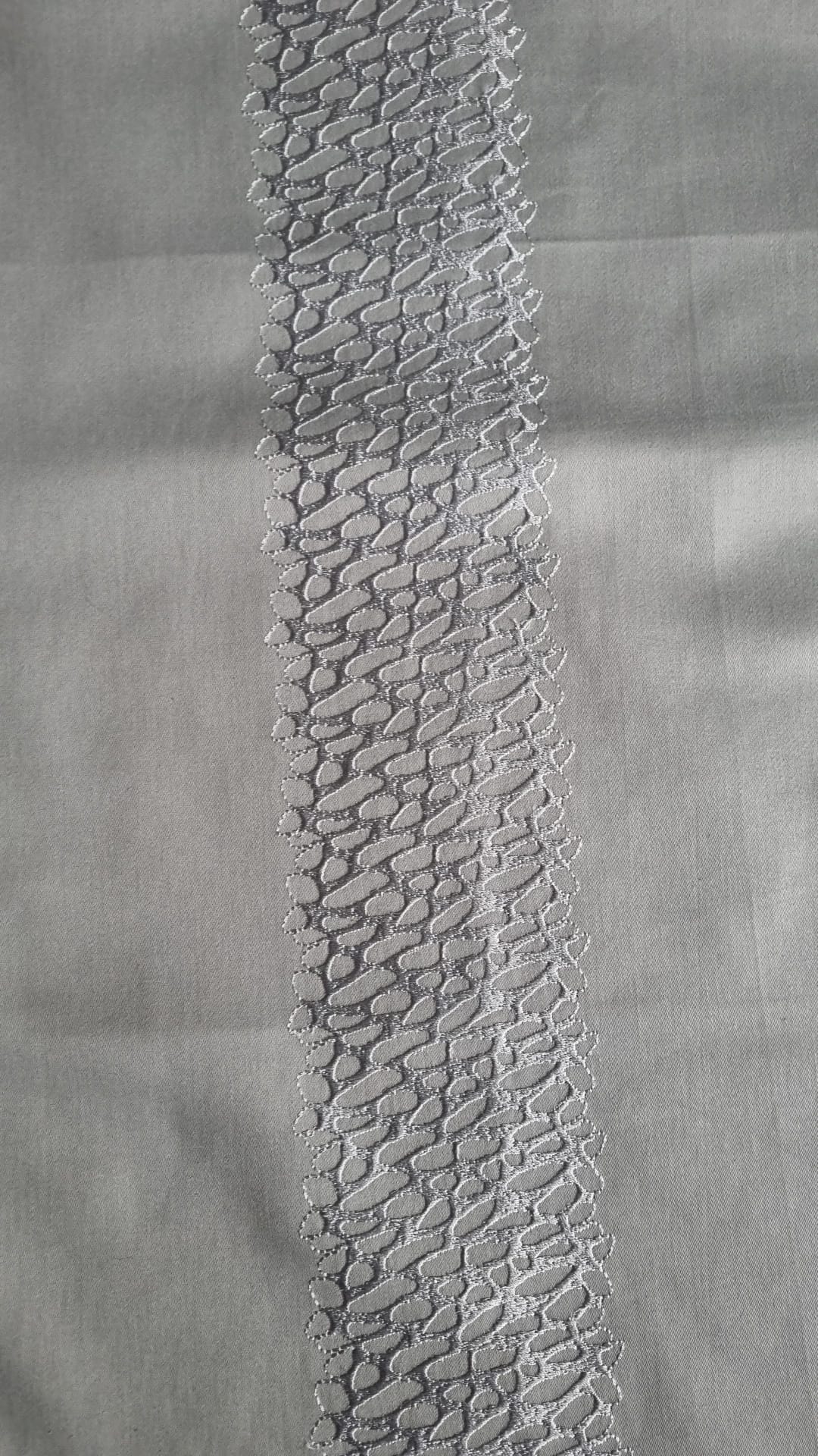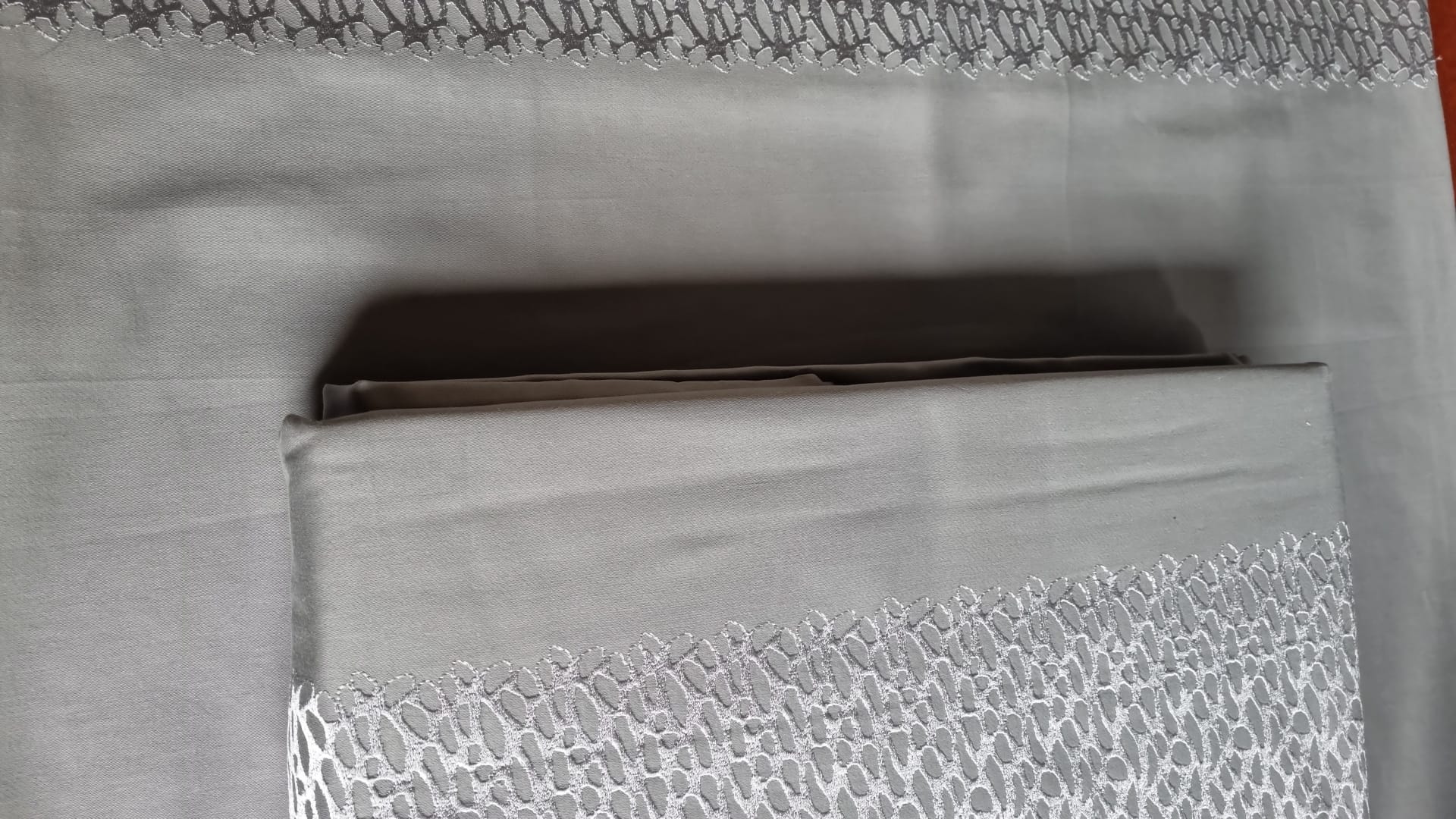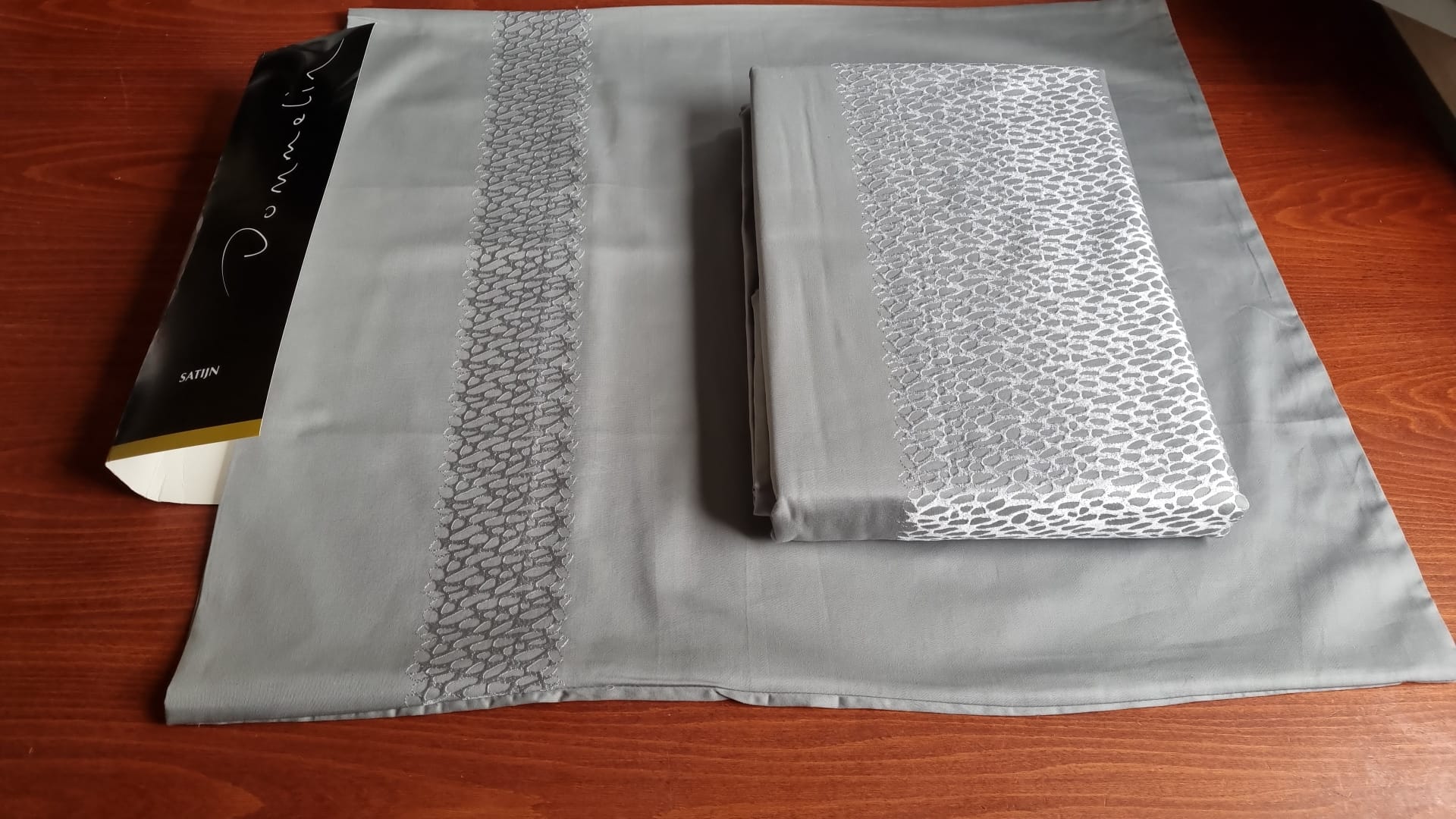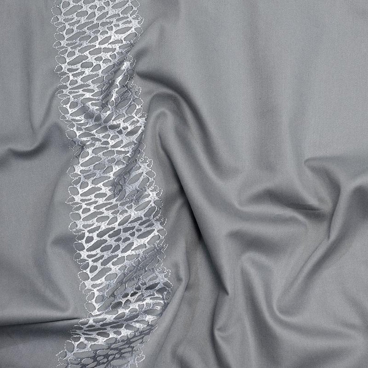 - Estee grijs is uitgevoerd in een fijne kwaliteit katoen satijn (300 TC) en is voorzien van een prachtige geborduurde strook van kleine kiezelvormige cirkels met zilverkleurige draad.