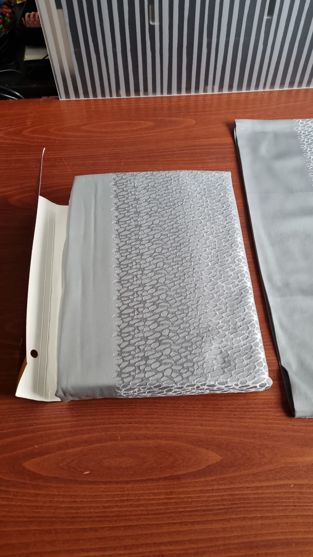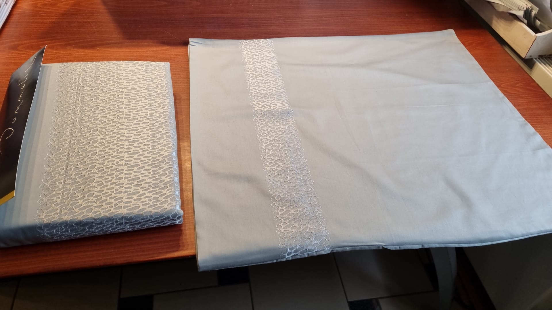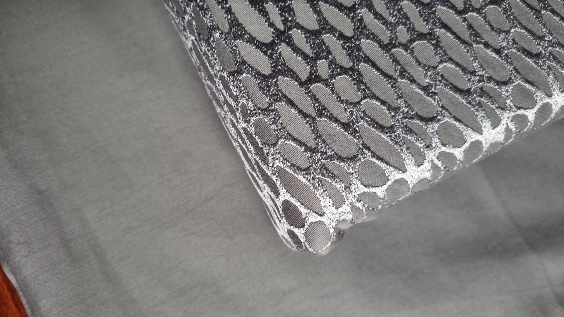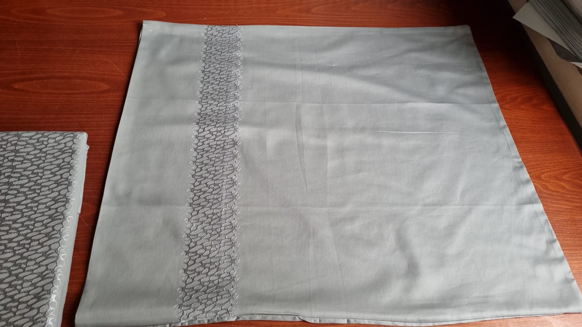 - Estee grijs is uitgevoerd in een fijne kwaliteit katoen satijn (300 TC) en is voorzien van een prachtige geborduurde strook van kleine kiezelvormige cirkels met zilverkleurige draad.