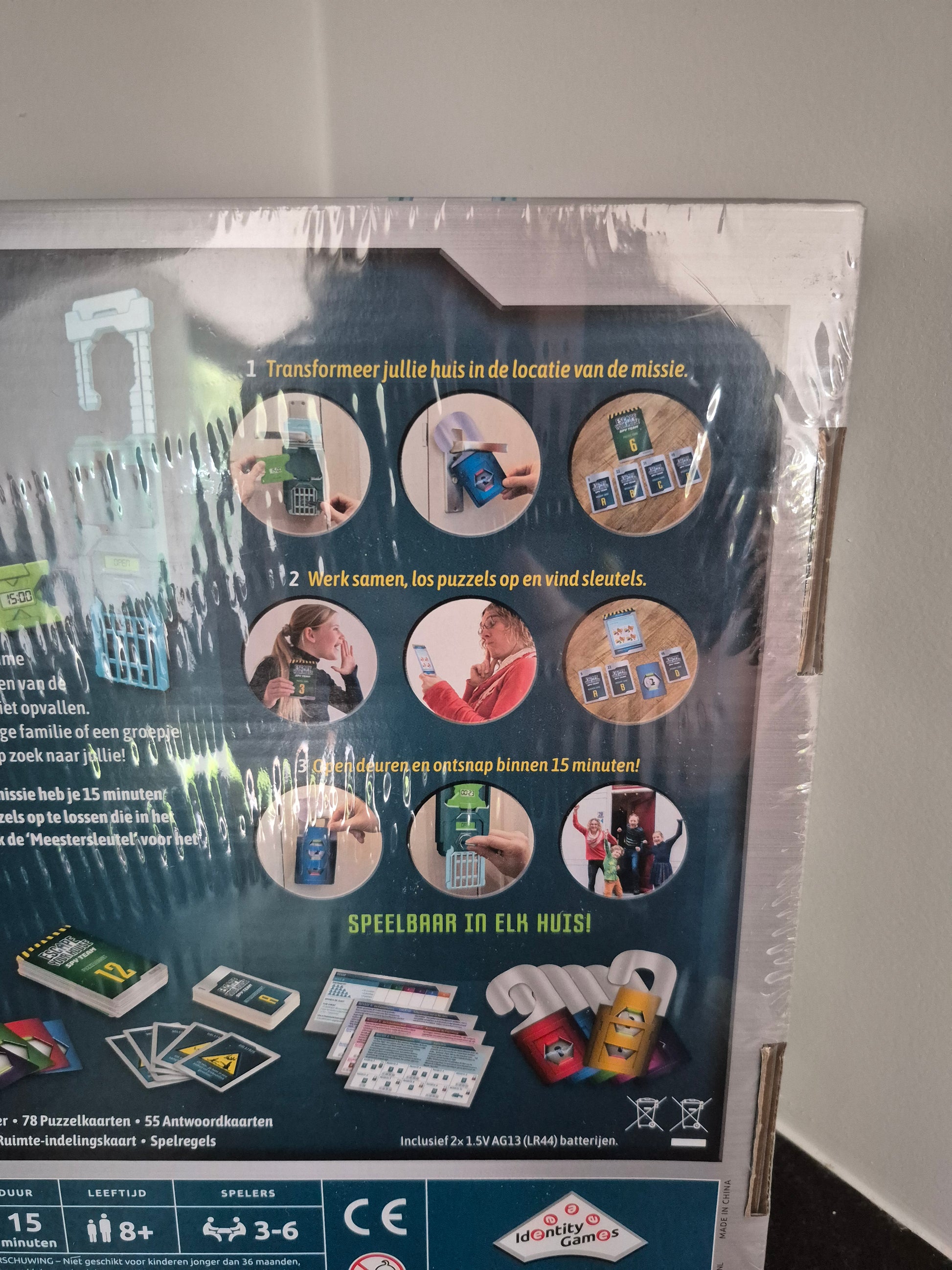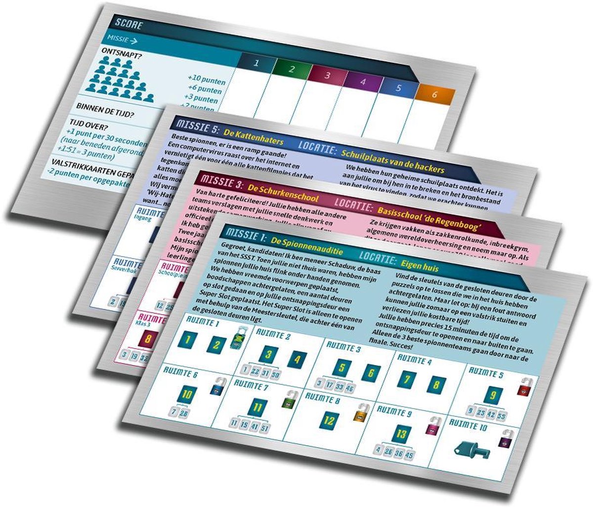 - Inhoud: 6 missies, Super Slot, Meestersleutel, timer, 78 puzzelkaarten, 55 antwoordkaarten, 6 deurhangers, 3 missiekaarten, score- & ruimte-indelingskaart en spelregels.