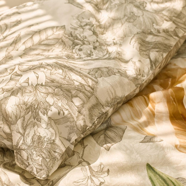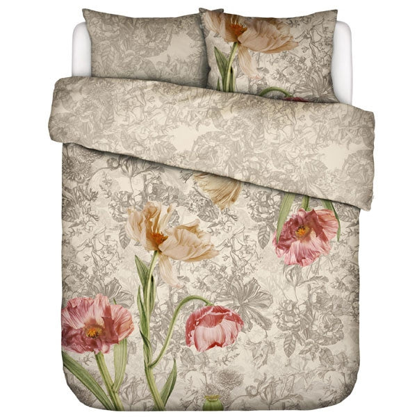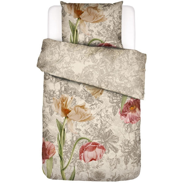 Haal de lente de slaapkamer in met dit prachtige Essenza Dekbedovertrek Annabel Vanilla. Op de achtergrond van de warme vanillekleurige ondergrond zijn getekende en geschilderde grijze bloemen te zien, maar de show wordt pas echt gestolen door de grote kleurrijke gefotografeerde bloemen daarboven.
