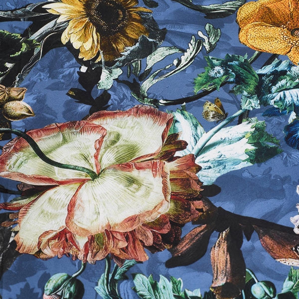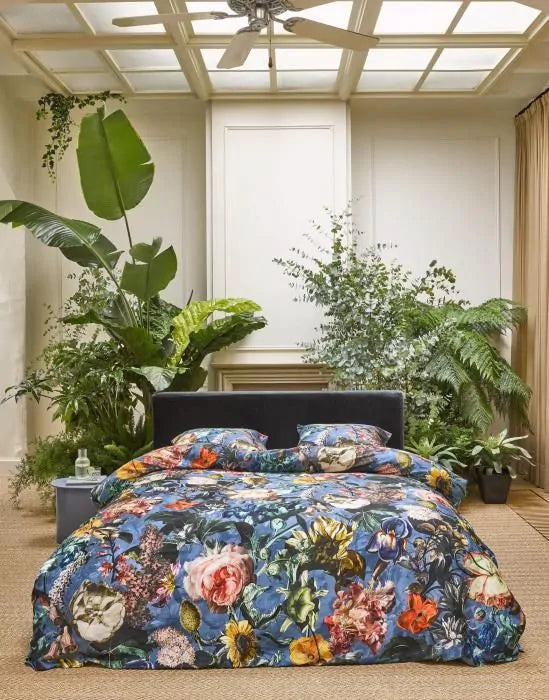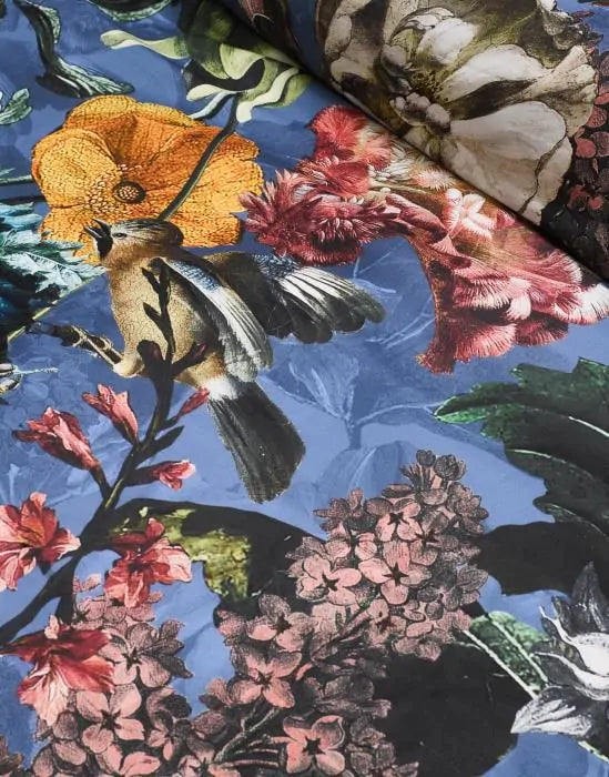 Tropische vogels en schilderachtige bloemen zijn gevangen in dit nieuwe dessin van ESSENZA! Op een blauwe ondergrond met de poëtische naam Moonlight Blue schitteren de mooiste bloemen in sprekende kleuren. Maar niet zomaar mooie bloemen: ESSENZA liet zich inspireren door spannende bloemen met een 'grillige' vorm van de stillevens uit de Gouden Eeuw. Op de achtergrond zijn prachtige ton sur ton schaduwen van bloemen te zien. Het Famke dekbedovertrek is gemaakt van katoen satijn: een zachte, gladde en licht glanzende stof. Dit Essenza dekbedovertrek is vervaardigd van de 100% katoen-satijn; 200TC. Katoen-satijn voelt heerlijk zacht aan en heeft een lichte glans. Perfect om zo'n sprekend dessin tot z'n recht te laten komen!