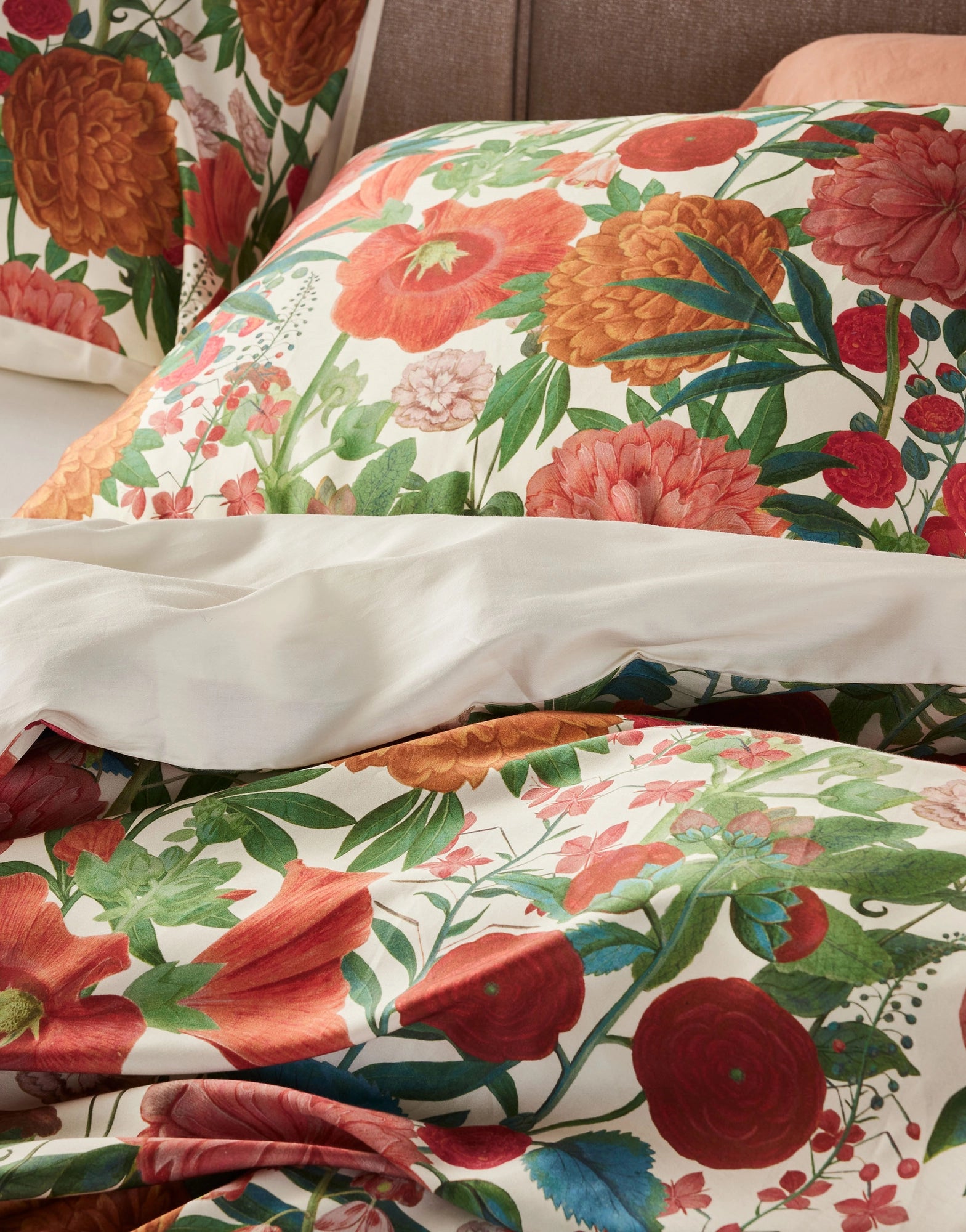 Essenza Florentien Lobster pink. Stap binnen in de wereld van Florentien, een prachtig dekbedovertrek met een bloemenprint die pioenrozen, stokrozen, wilgenroosjes, anjers en Perzische lelies in overvloed toont. De groene bladeren verweven zich sierlijk door het ontwerp, wat zorgt voor een fris contrast. Dit patroon is geïnspireerd door de tekeningen van Anselmus Boëtius de Boodt uit de late 16e en vroege 17e eeuw en is zorgvuldig samengesteld uit zijn prachtige geïllustreerde albums. De bloemen in rode, roze en paarse tinten vormen samen een harmonieus geheel. Draai het dekbedovertrek om voor een rustgevende uni kleur die het geheel in balans brengt.