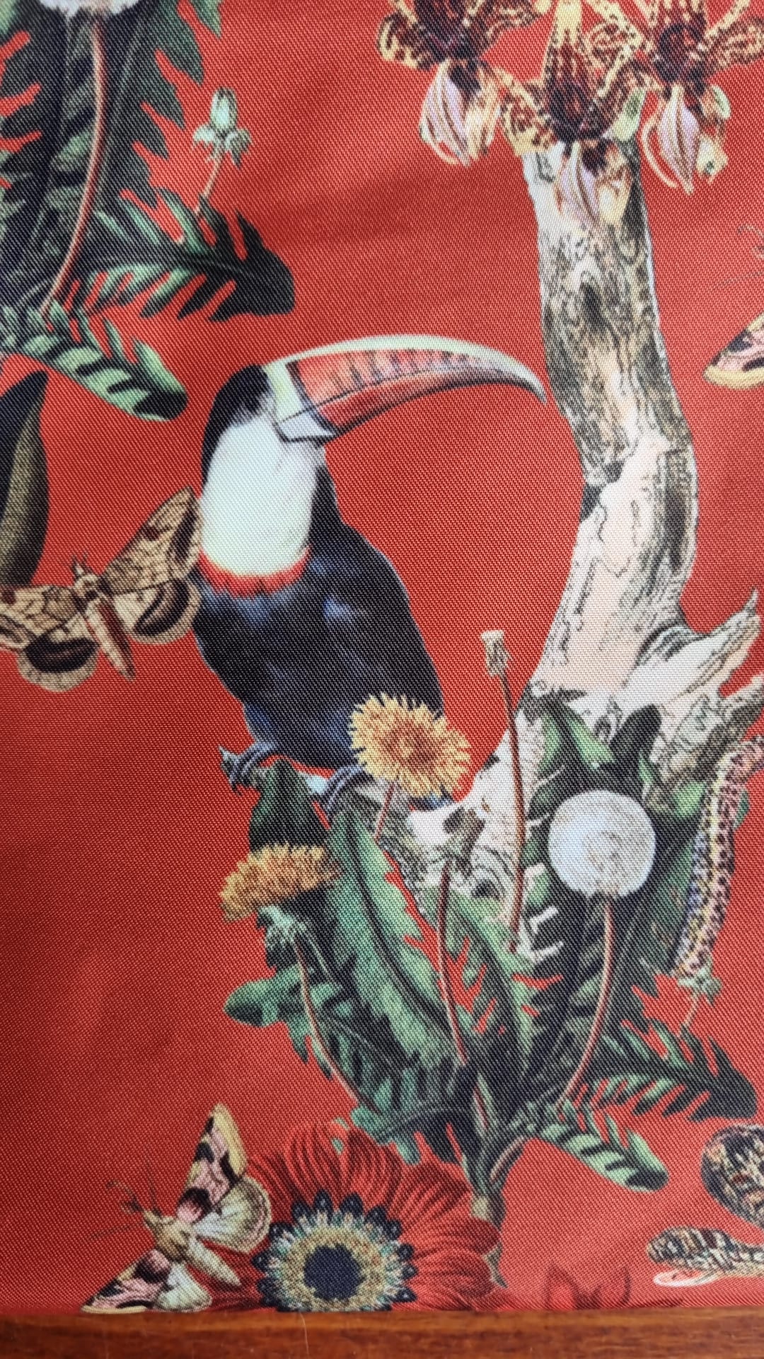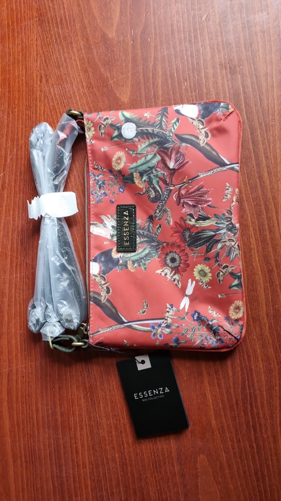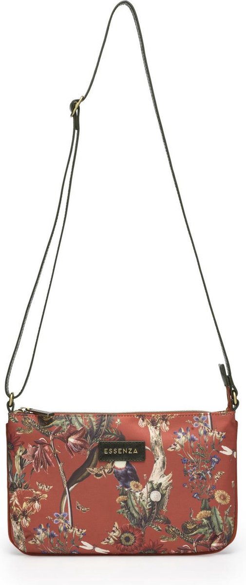 Dit handzame schoudertasje van ESSENZA is verleidelijk mooi! De rijke botanische print laat het mooiste uit de natuur zien: van exotische bloemen en planten tot een toekan. De vurige chilitint van de schoudertas is bovendien helemaal on trend. De tas heeft een ritssluiting en een verstelbare donkergroene schouderband van fake leather. De binnenkant van de tas heeft een vrolijk stippenpatroon. Deze tas is PVC-vrij. Afmeting: L 25 cm x D 2 cm x H 16 cm