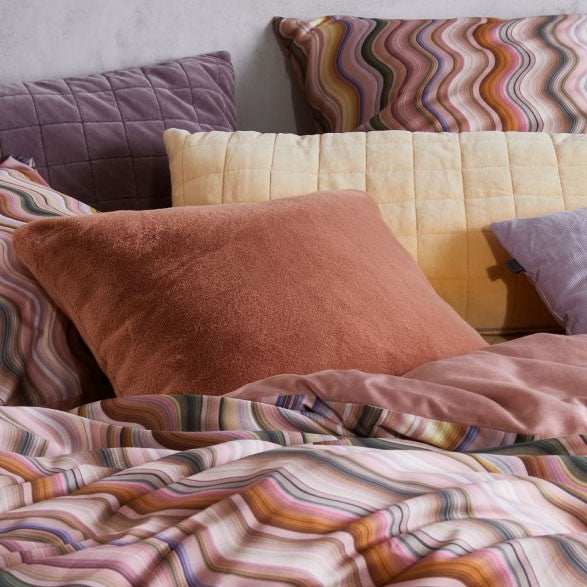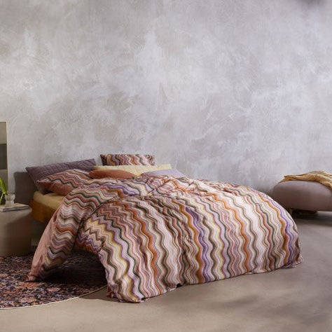 Voor dit dessin zijn – ter ere van het 5-jarig bestaan van de bestsellerprint Fleur – alle kleuren van de Fleur geselecteerd en in een golvend patroon gerangschikt. En tadaaa, hier is dekbedovertrek Sol: is ’t geen plaatje? Als je goed kijkt bestaat het nieuwe Sol dessin uit ontelbare dunne strepen. Hij voelt daardoor een tikkeltje retro maar is zeer elegant en krachtig tegelijk. Een waanzinnig statement voor in de slaapkamer.