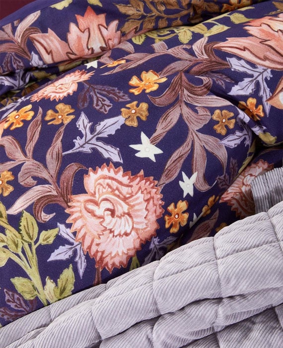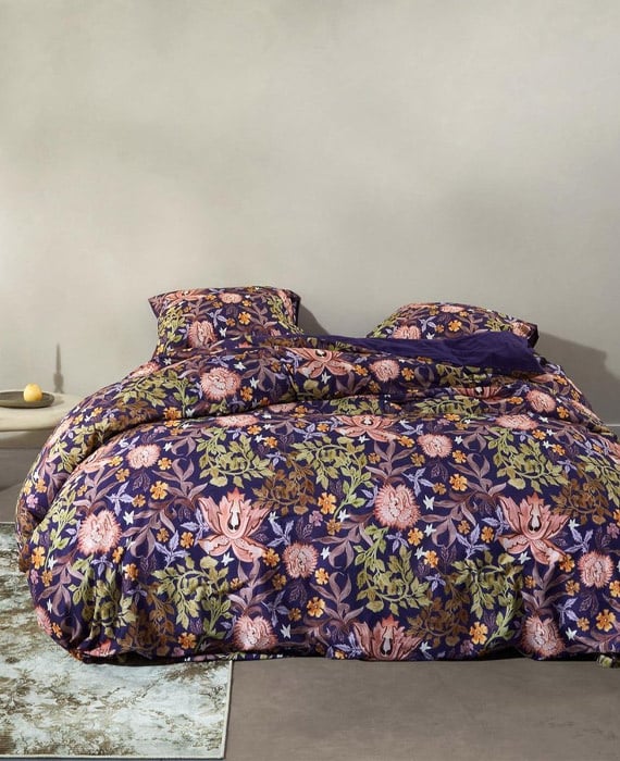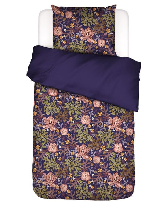 Essenza dekbedovertrek Veron bevat een prachtige print met handgeschilderde bloemen in diverse vrolijke kleuren. De achterkant van dit overtrek is effen paars.