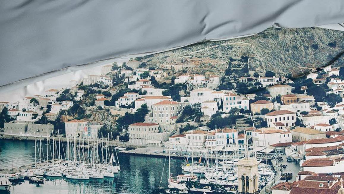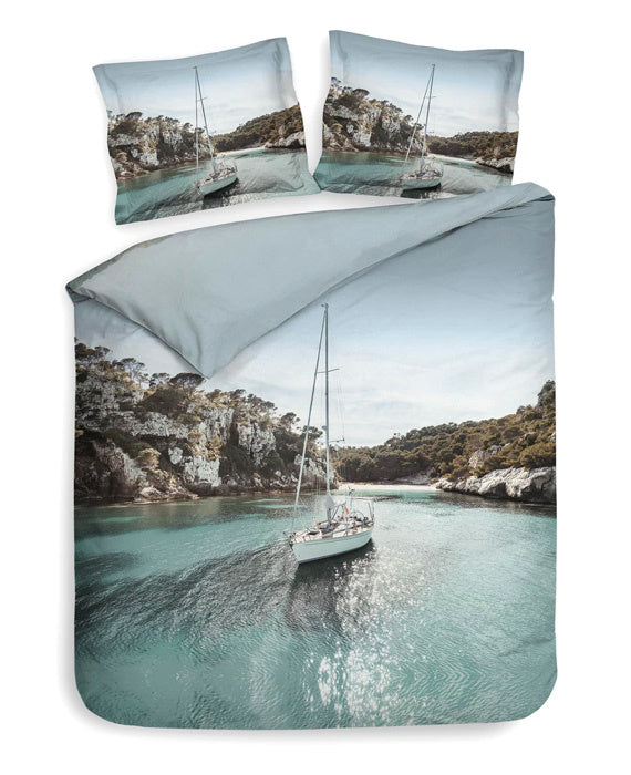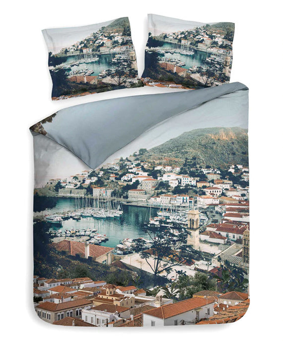 Heckett Lane Nada katoensatijn 230TC dekbedovertrek vakantie haven, stadje en zeilboot