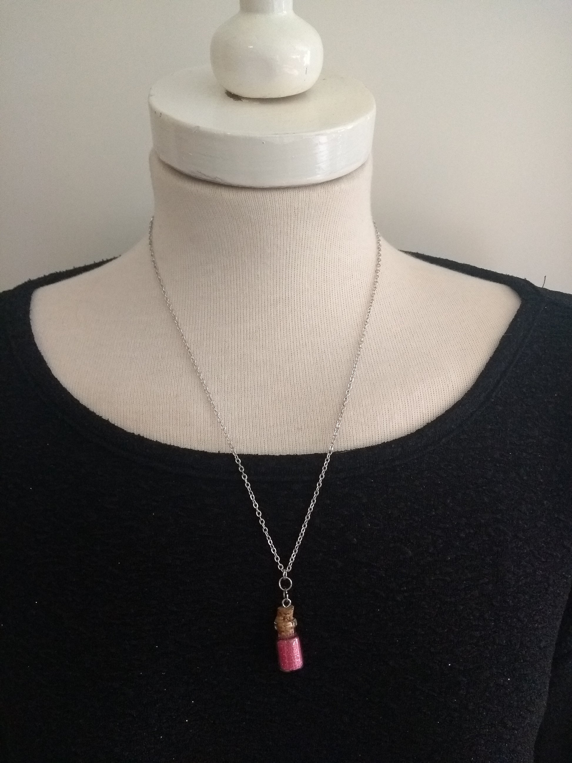 Ketting zilverkleurig ongeveer halslengte 25cm en totale lengte 50cm. Glazen flesje met roze erin.