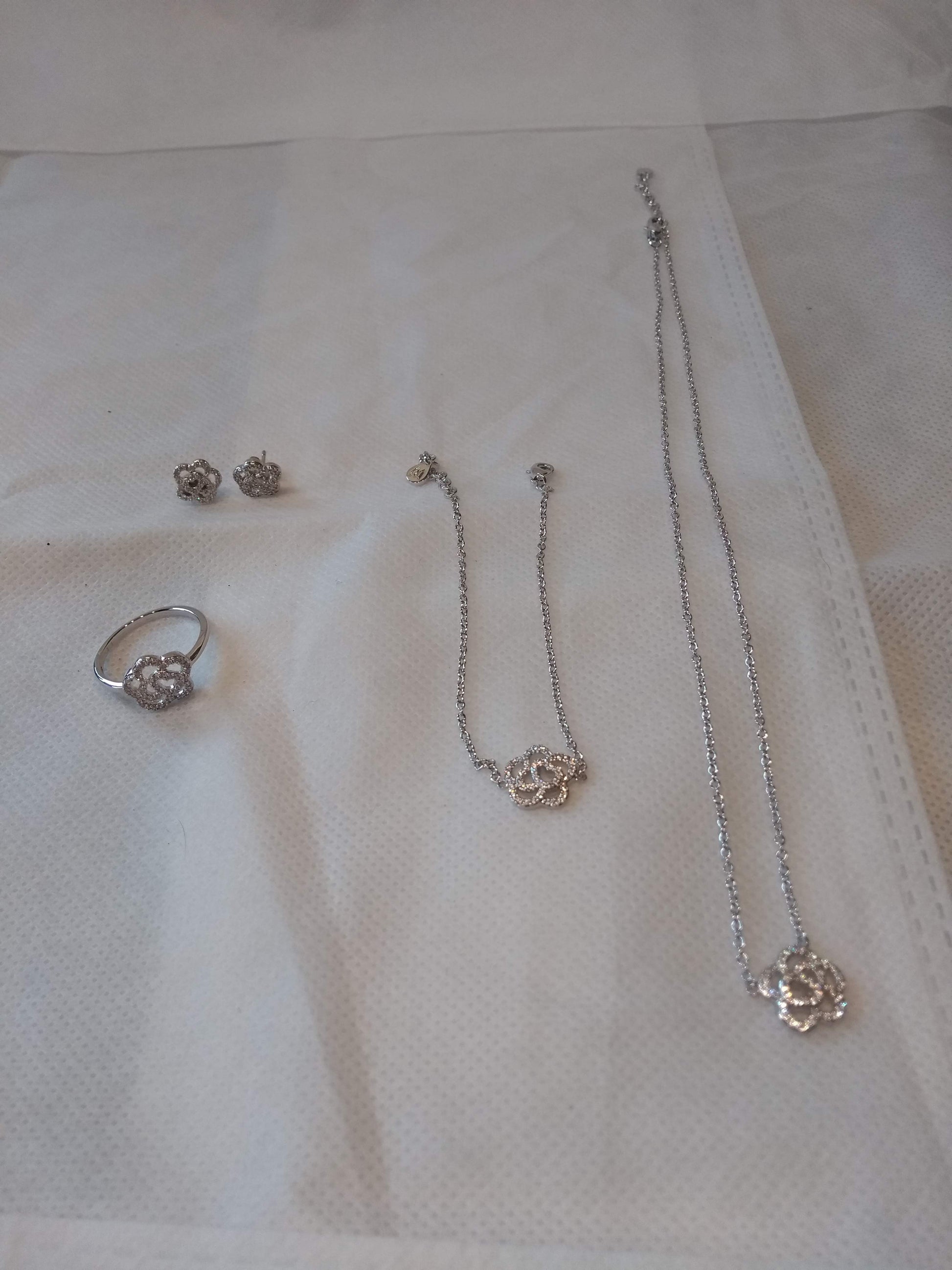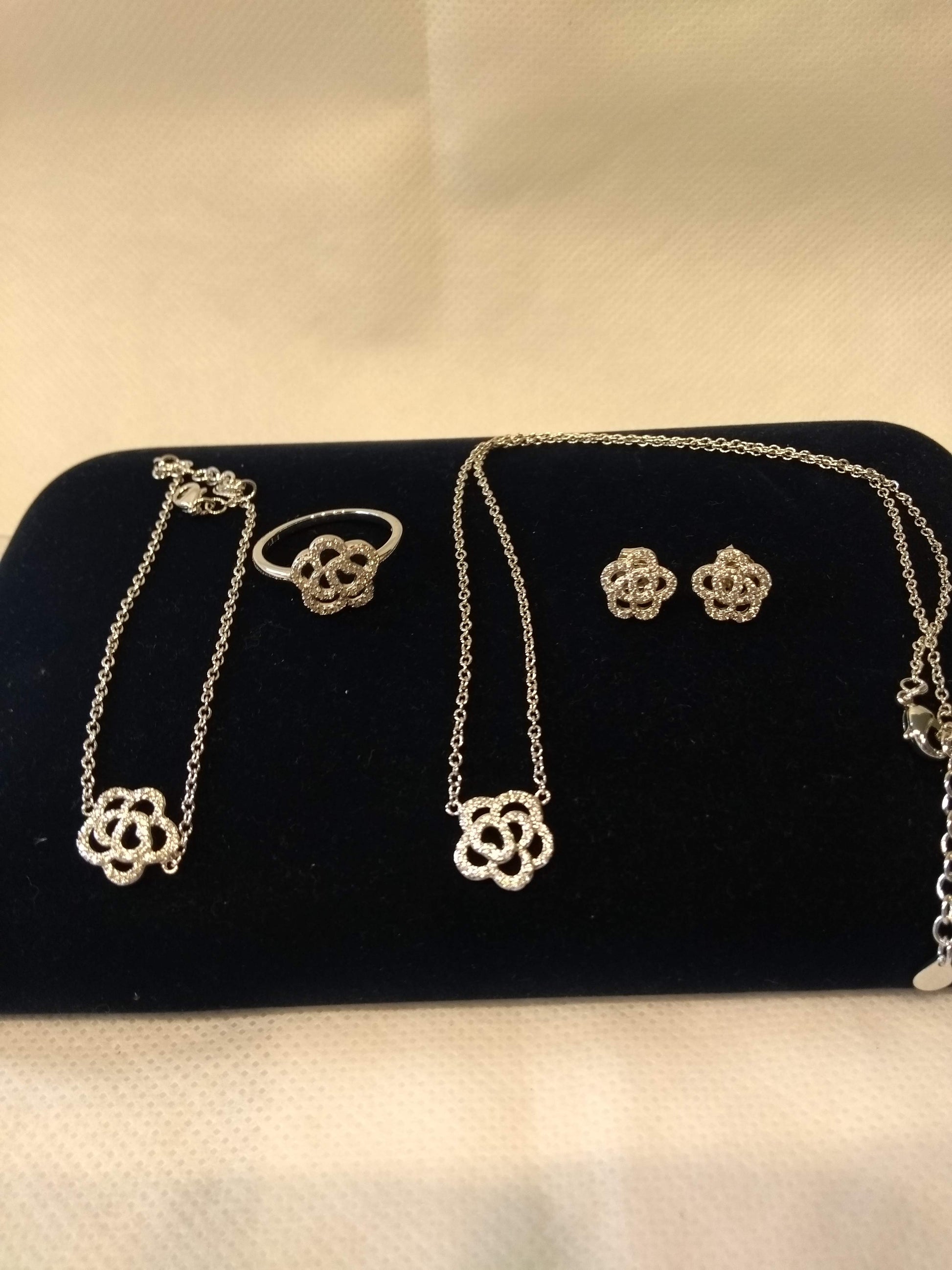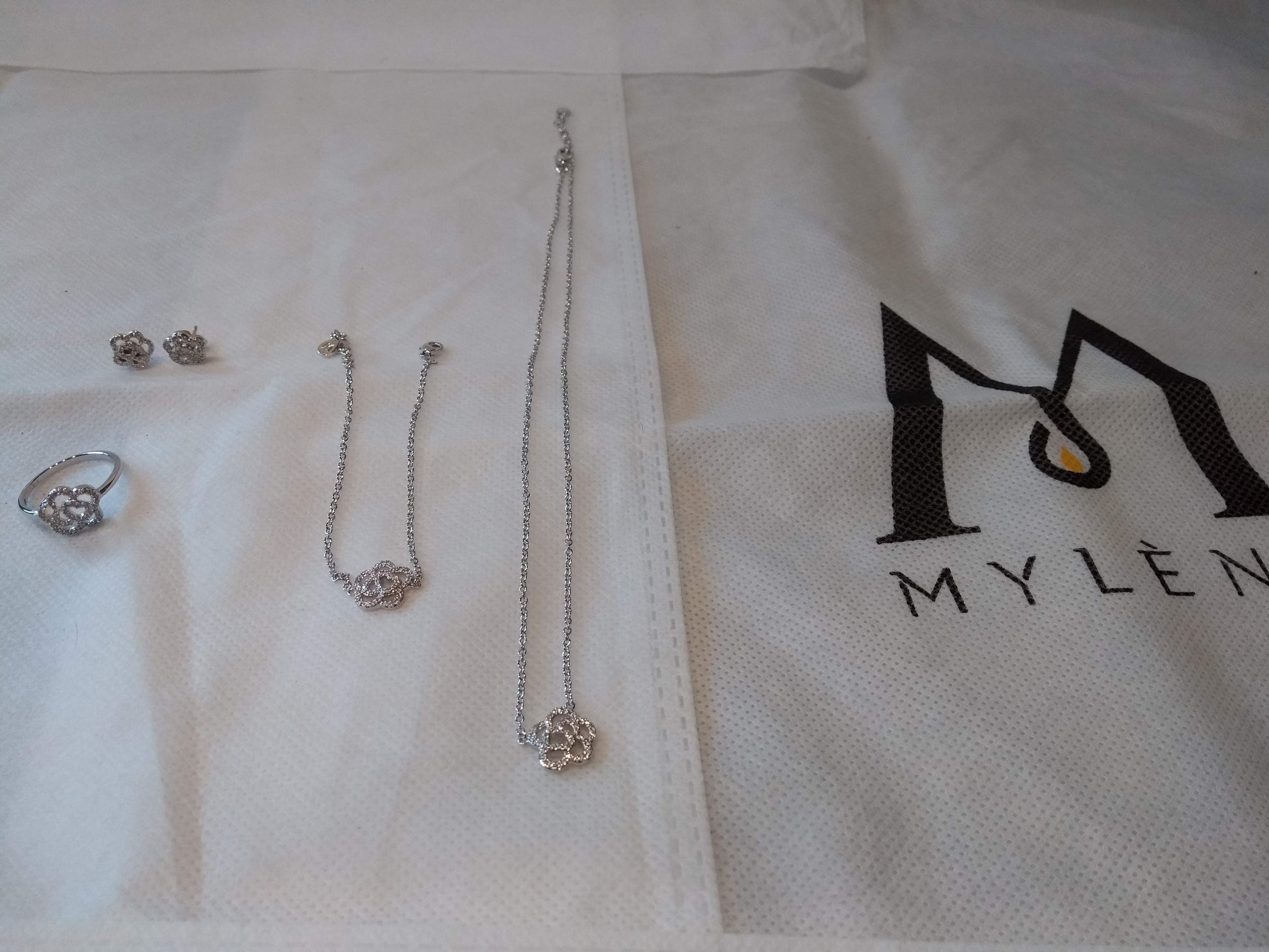 Alle juwelen uit de Flower-collecties zijn vervaardigd uit messing (brass). De zilverkleurige juwelen zijn afgewerkt met een laag rhodium. Rhodium zorgt voor een mooie en langdurige glans. De elegante vormen van de gestileerde bloemen zijn tijdloos. De hals ketting is 42 cm lang en heeft een verlengstuk van 3 cm.