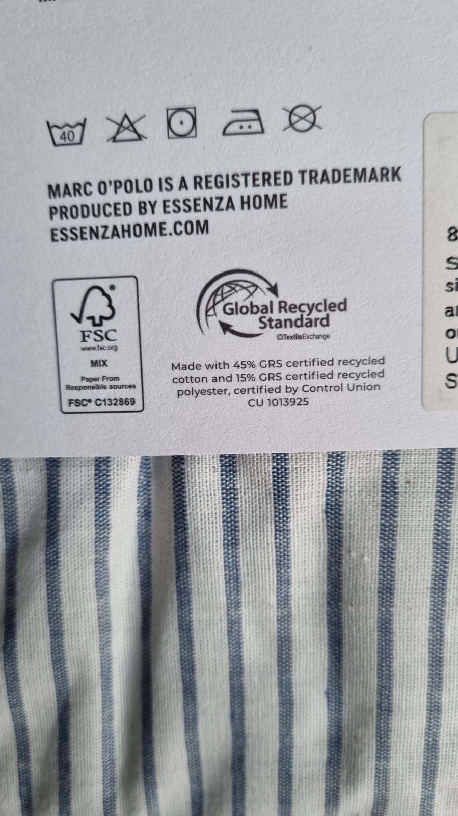 Deze kussensloop is gemaakt van een stevige cotton blend: 45% gerecycled katoen, 40% katoen en 15% gerecycled polyester. Het gebruikte materiaal is GRS-gecertificeerd (Global Recycled Standard), wat betekent dat het voldoet aan strenge eisen op het gebied van gerecyclede inhoud, milieu en sociale omstandigheden in de productie.