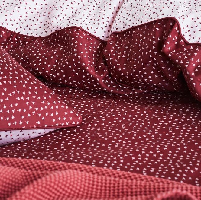 - Huidvriendelijke en ademende kussensloop met delicate bloemen op een krachtige bordeauxrode ondergrond.