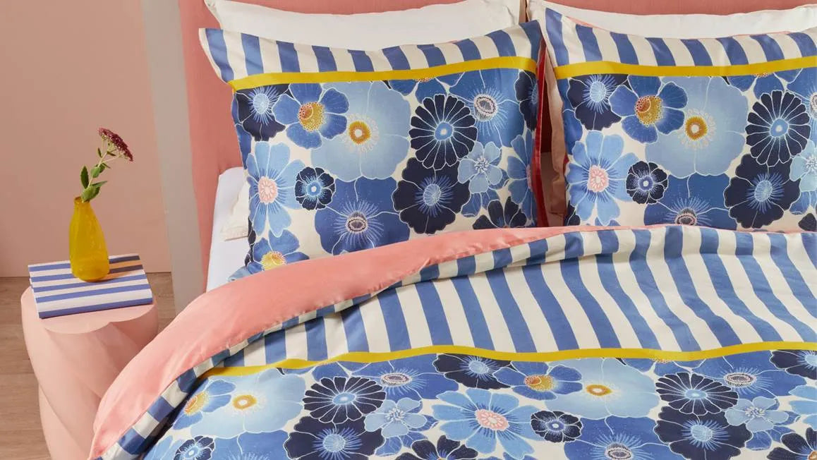 Dekbedovertrek Nica van Oilily geeft een kleurrijk tintje aan een moderne en trendy slaapkamer. Het ontwerp is geïnspireerd op oude sits-stoffen, maar in een modern jasje gestoken. De print, van aquarelbloemen in blauwtinten, met subtiele oker en peach accenten, heeft een vrolijke uitstraling. De frisse strepen aan de bovenzijde geven het overtrek een speelse twist. De achterzijde van dekbedovertrek Nica heeft een effen roze kleur. Over Oilily Bedtextiel van Oilily staat bekend om unieke kleurcombinaties, vrolijke ontwerpen, rijke en unieke prints en oog voor detail. Duurzame verpakking De verpakking is niet alleen mooi maar ook nog eens duurzaam. Om het dekbedovertrek heen zit een banderol gemaakt van FSC-karton. De banderol heeft in het midden een uitsnede, zodat je het dessin goed kunt zien. Gooi de banderol weg met het karton voor recycling.