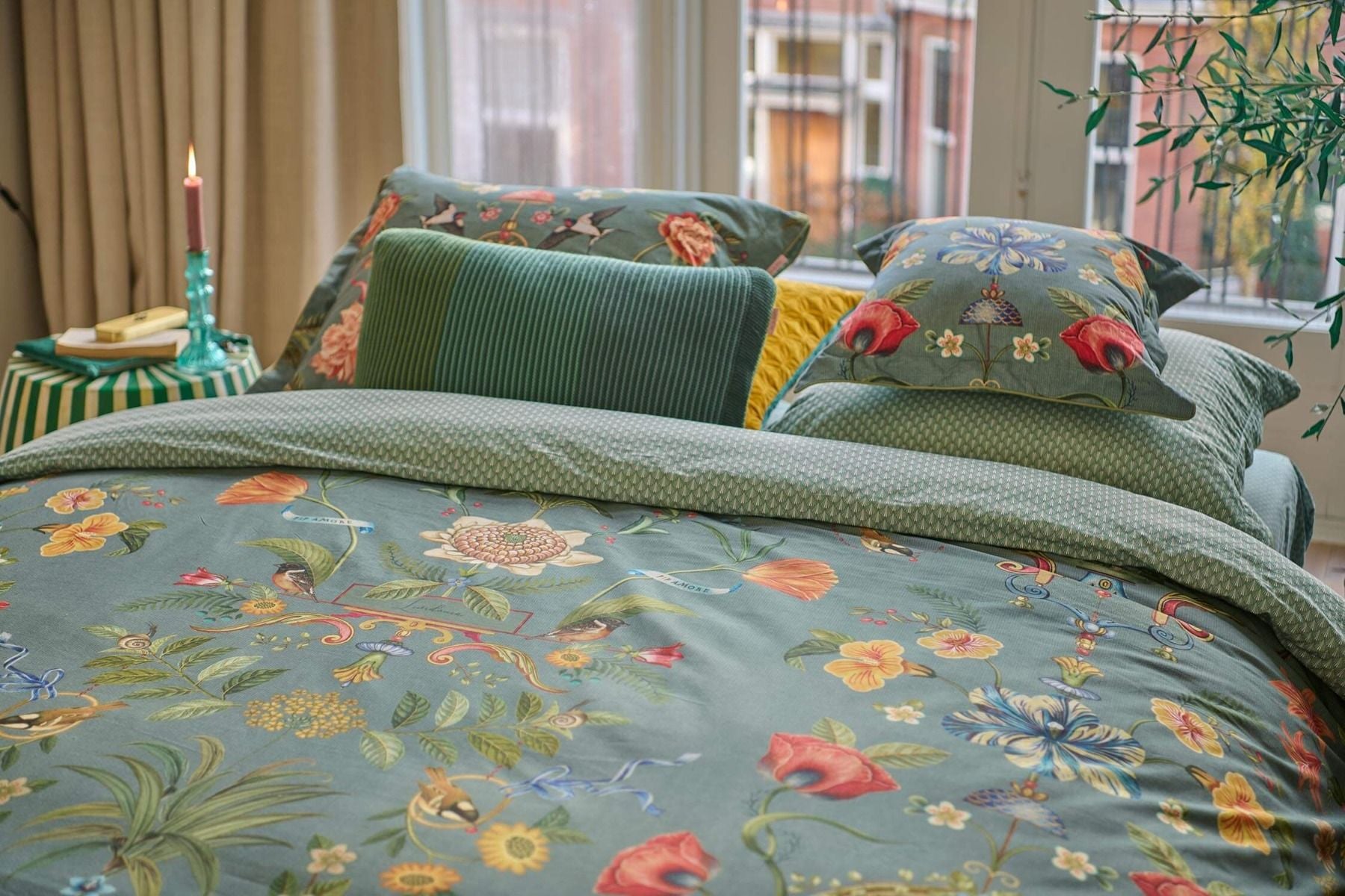 Botanico Verde blue doet denken aan een muurschildering in een statig landhuis. Het dessin is symmetrisch opgebouwd uit verschillende bloemen, vogels en ornamenten die verwijzen naar Italië. Door het royale formaat van het dessin en het kleurgebruik is dit dekbedovertrek een echte blikvanger in je slaapkamer. 100% katoen percal 200TC.