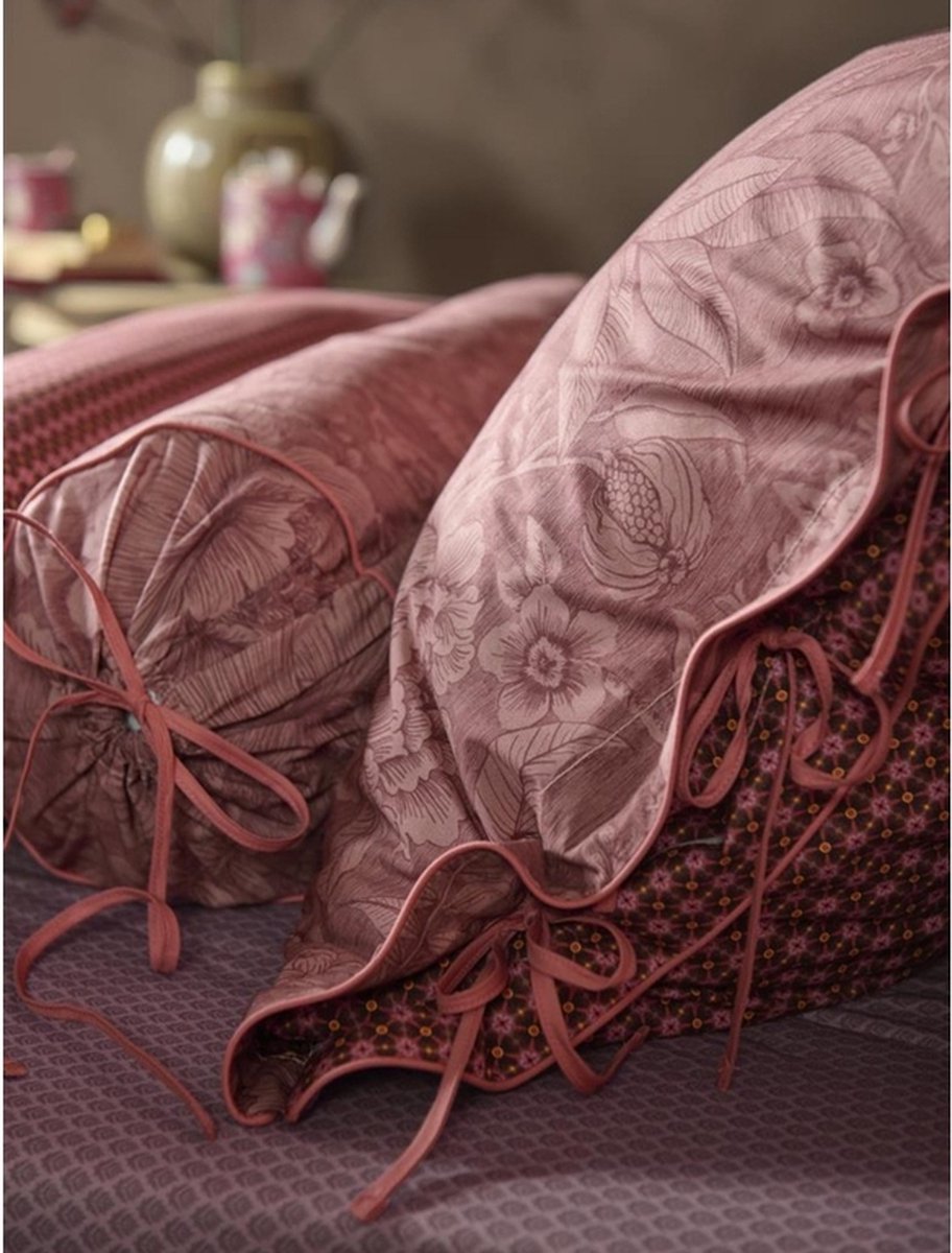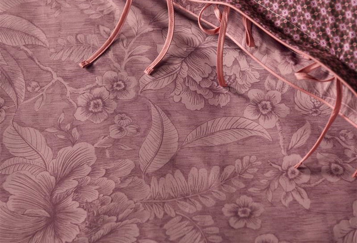 De kussenslopen en het dekbedovertrek hebben een doorgestikte oxford rand aan de zijkanten en zijn afgewerkt met een ronde bies, daarnaast hebben de kussenslopen een unieke striksluiting dit alles geeft het dekbedovertrek en de kussenslopen een extra rijke en luxe uitstraling. De achterkant van het dekbedovertrek en de kussenslopen hebben een print van kleine bloemetjes, waardoor het dubbelzijdig gebruikt kan worden. Dit geeft een speels mix&match-effect op je bed.