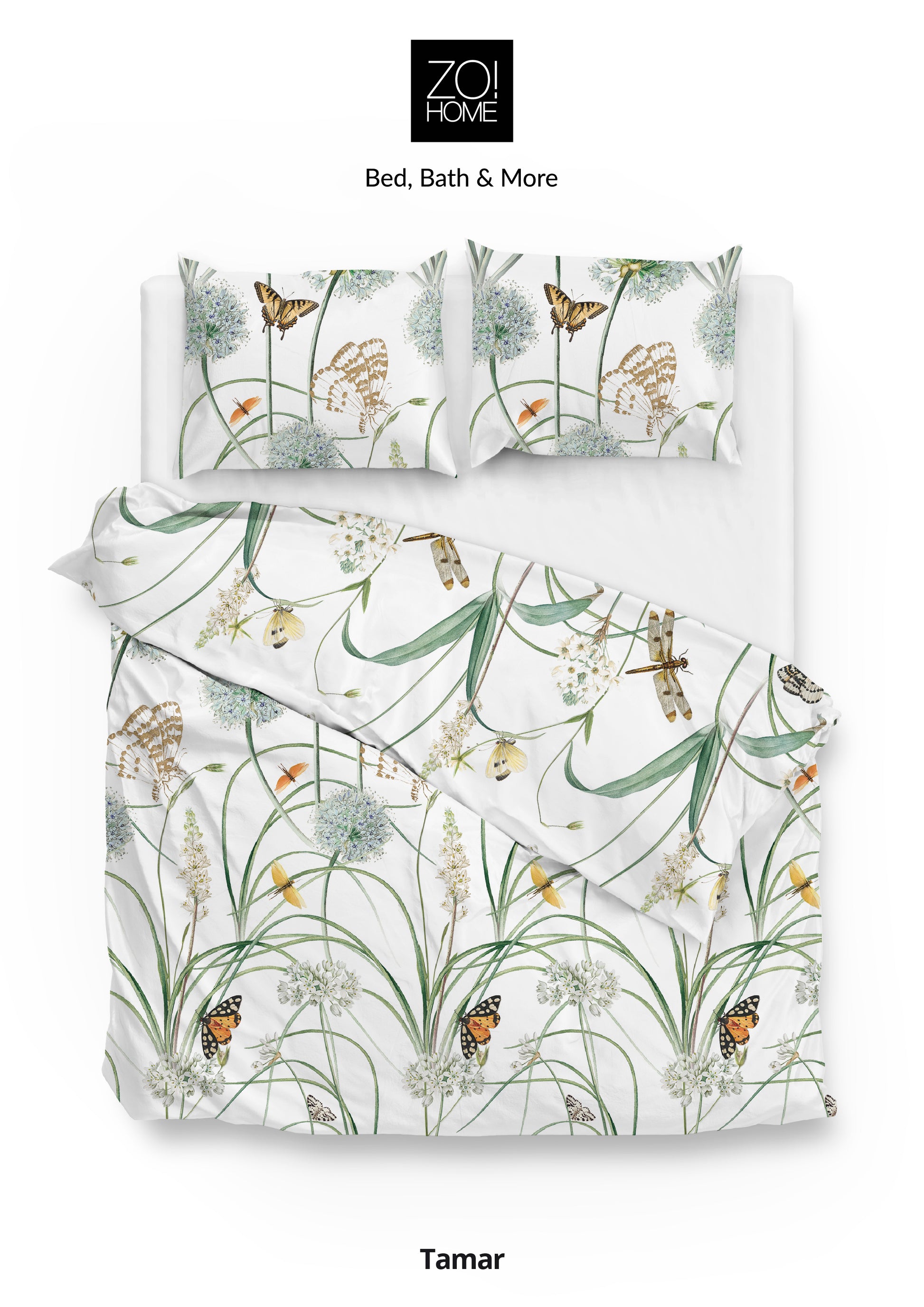 Met het Tamar dekbedovertrek van Zo!Home haal je de natuur in huis. Dit mooie overtrek heeft een wit dessin met vrolijke vlinders, libellen, bloemen en planten. Op de print is genoeg te zien om steeds nieuwe details te ontdekken. Deze leuke details komen ook terug op de kussenslopen die standaard meegeleverd worden. Het overtrek voegt met de kleuren wit, groen en geel een frisse sfeer toe aan je interieur.